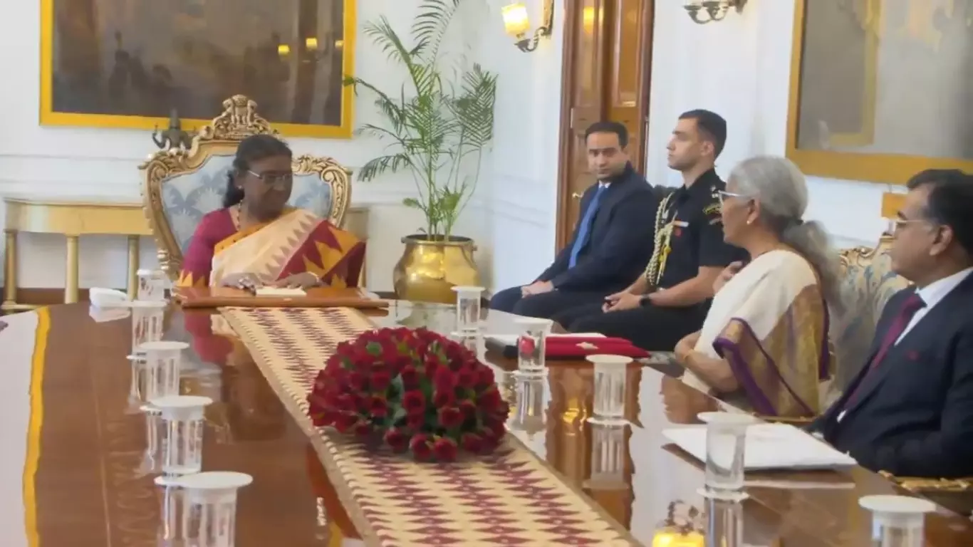 Finance Minister Nirmala Sitharaman meets President Droupadi Murmu at Rashtrapati Bhavan, ahead of the Budget presentation at 11am in Parliament.