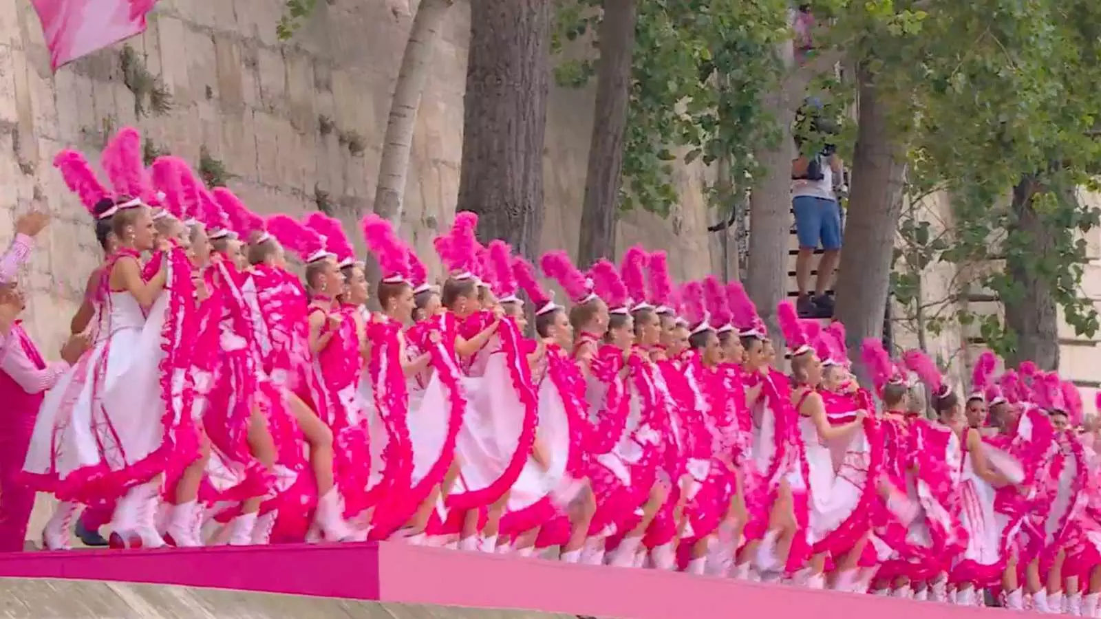 80 artists from the Moulin Rouge perform the iconic dance that dates back to the 1820s. Their pink costumes have been specifically designed for the opening ceremony