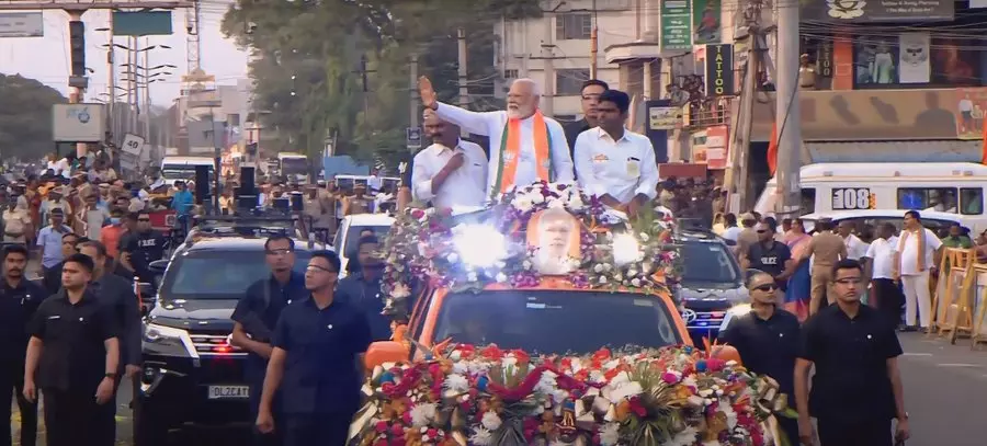 As Modi began his roadshow in an open vehicle,... ... PM Roadshow in Coimbatore live: BJP party-men chant slogans hailing Modi