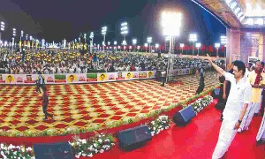 Chief Minister MK Stalin waves at the crowd during a public meeting in Sriperumbudur on Tuesday