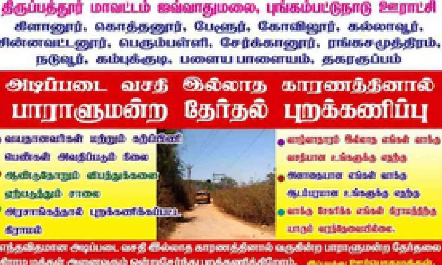 Residents of remote tribal hamlets constituting these villages and atop Jawadhu Hills near Tirupathur town, have erected banners in their villages, asking political parties not to visit them to canvas for votes for the Lok Sabha election.