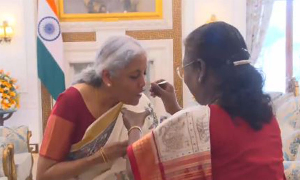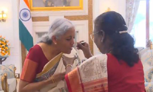 President Droupadi Murmu offered 'dahi-cheeni' (curd-sugar), to Union Finance Minister Nirmala Sitharaman ahead of presenting Budget 2025