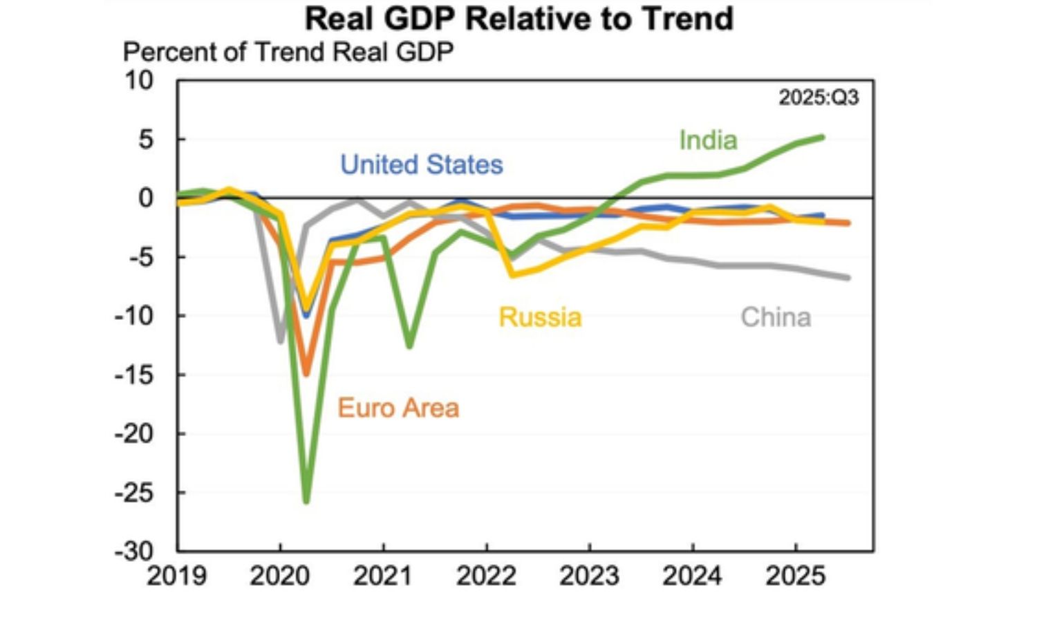 From a - 5 per cent trough in 2020, its GDP relative to trend rocketed past pre-Covid levels by 2022, reaching + 3 per cent in 2024 and projected to hit + 5 per cent in 2025 Q3.