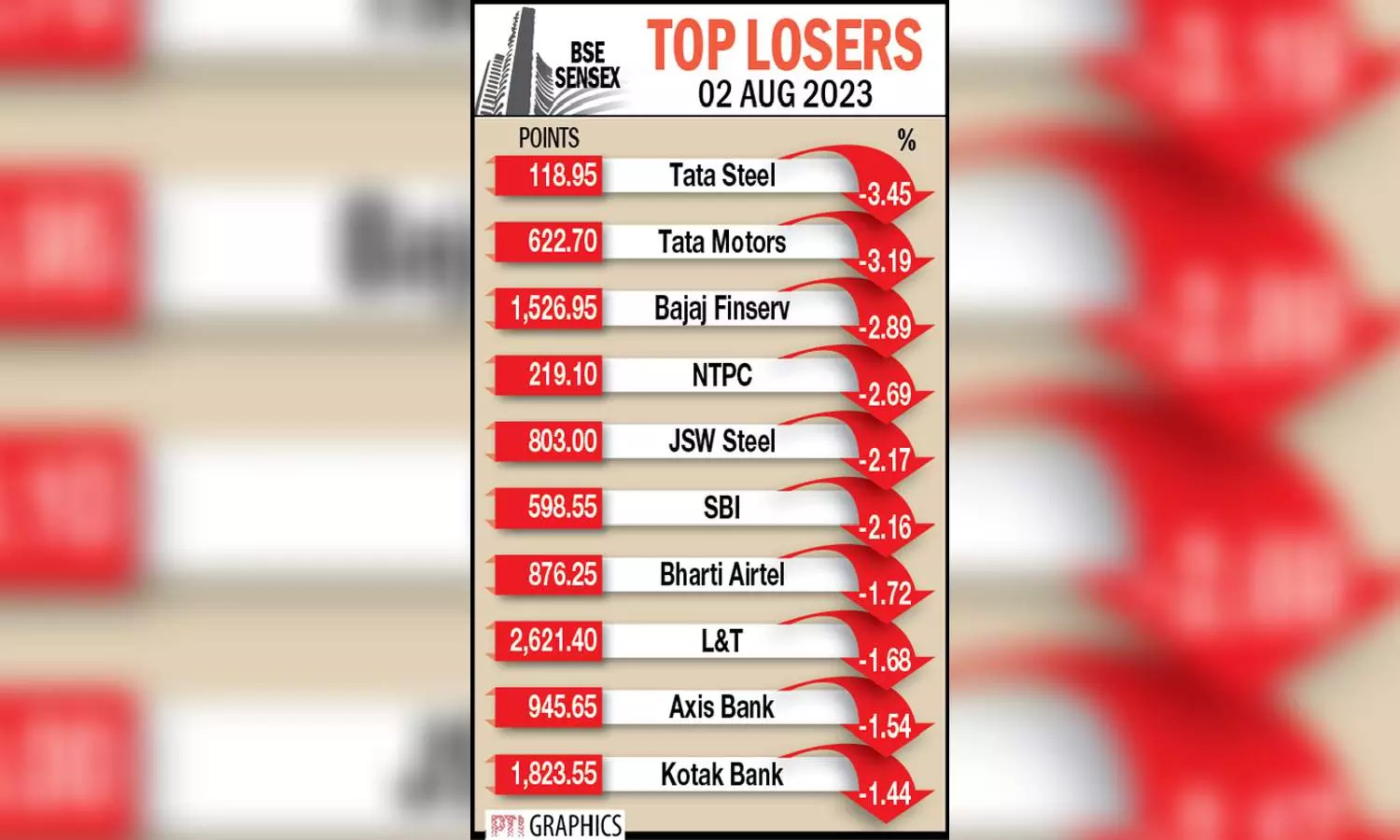 “The Indian market witnessed a broad sectoral slide, affected by weak global market trends. Negative news regarding the US rating downgrade on fiscal concerns, coupled with weak factory activity data from Eurozone and China, led to widespread worries across the globe. Additionally, prolonged FII selling, triggered by a rise in US bond yields, has disrupted the mood of the domestic market,” said Vinod Nair, Head of Research at Geojit Financial Services. From the Sensex pack, Tata Steel declined 3.45 per cent, followed by Tata Motors 3.19 per cent. Bajaj Finserv, NTPC, State Bank of India, JSW Steel, Larsen & Toubro and Bharti Airtel were among the other major laggards. Nestle, Hindustan Unilever, Asian Paints, Tech Mahindra and UltraTech Cement were the gainers.