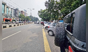 Two-wheelers occupy much of the service road, forcing cars to park on the yellow line and close to designated bus stops. The result is that approaching buses cannot always pull into the bay, and passengers must step onto the road. It creates both traffic snarls as well as raises safety concerns during peak hours.