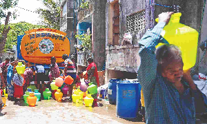 Residents of TNHB complex in Saidapet rush to collect water from Metro Water’s tanker on a hot summer day (file)