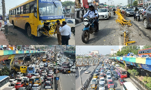 CHENNAI: Traffic was choked on the GST Road on Friday morning after a private college bus met with an accident on the Pallavaram flyover, blocking traffic for more than two and a half hours. Thousands of commuters, including air passengers, were stranded in the congestion that was over three kilometres.