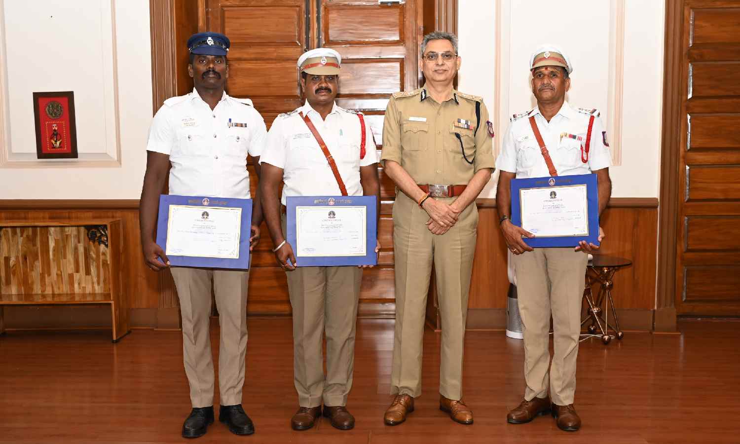 DGP Jiwal honored SSI Murugan, SI Gandhi, and PC Mohanraj with Certificates of Appreciation at the state police HQ Chennai, praising their “quick, dedicated act” that “saved countless lives.”