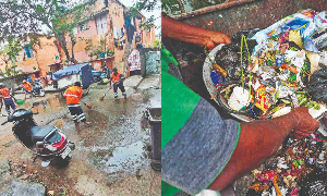 Workers clearing stagnated water from roads and garbage bins with no gloves