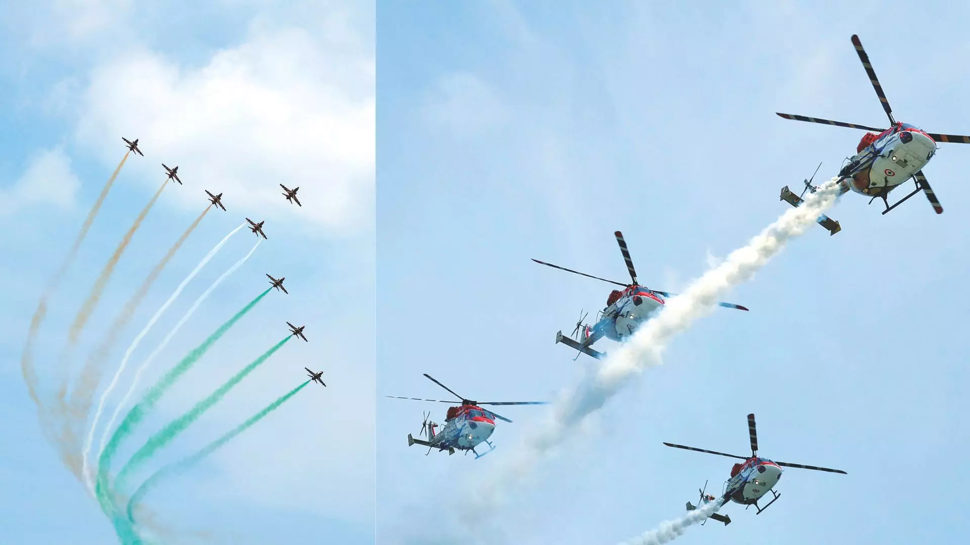 The Sukhoi-30s, taking off from Thanjavur, thrilled the crowd with their loop, tumble, yaw, and vertical Charlie manoeuvers while dispensing flares.
