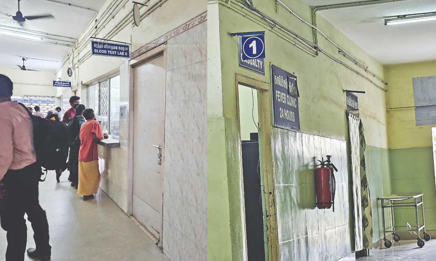 (L-R) Anna Nagar Peripheral Hospital; 24-hr fever clinic with no doctor on duty at Tondiarpet