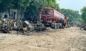A private water tanker parked in a shed surrounded by scrap and waste materials burned in Periya Mathur, Manali