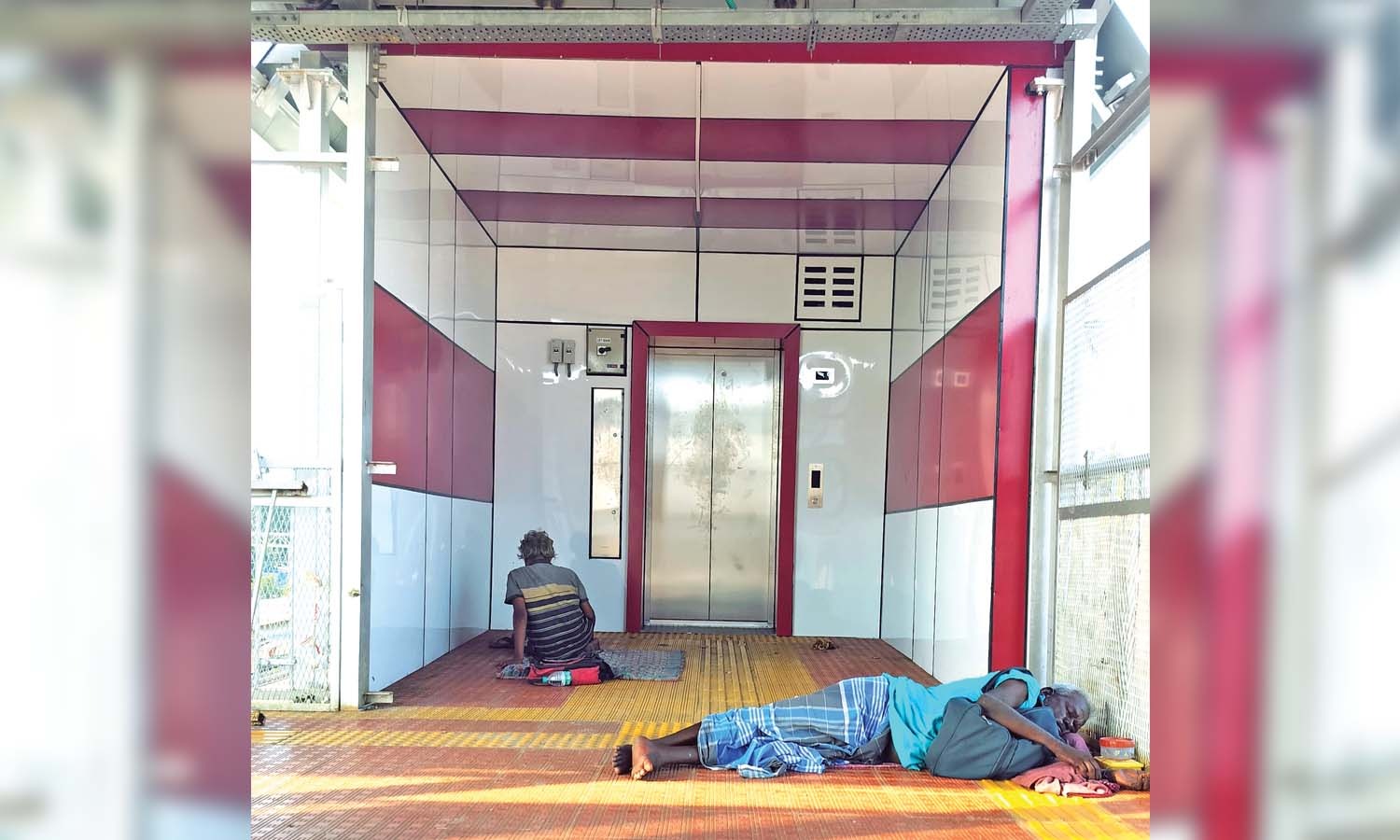 People sleeping near the elevator, which has remained closed over for more than a year