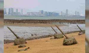 Anti-landing barricades are seen on the beach with China's Xiamen in the background in Kinmen (Photo/Reuters)