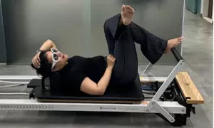 In the photo, the actress is seen lying down on the pilates machine, wearing athleisure and sunglasses.