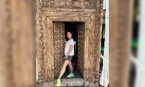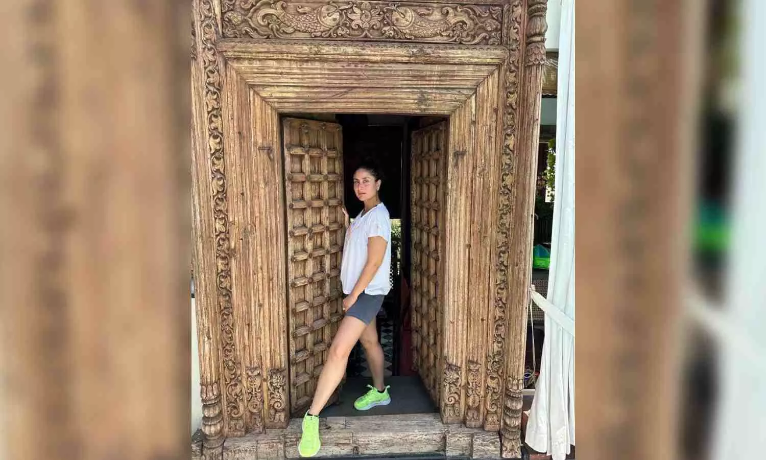 The images show Kareena posing in a white t-shirt that she paired with a grey shorts and green shoes.