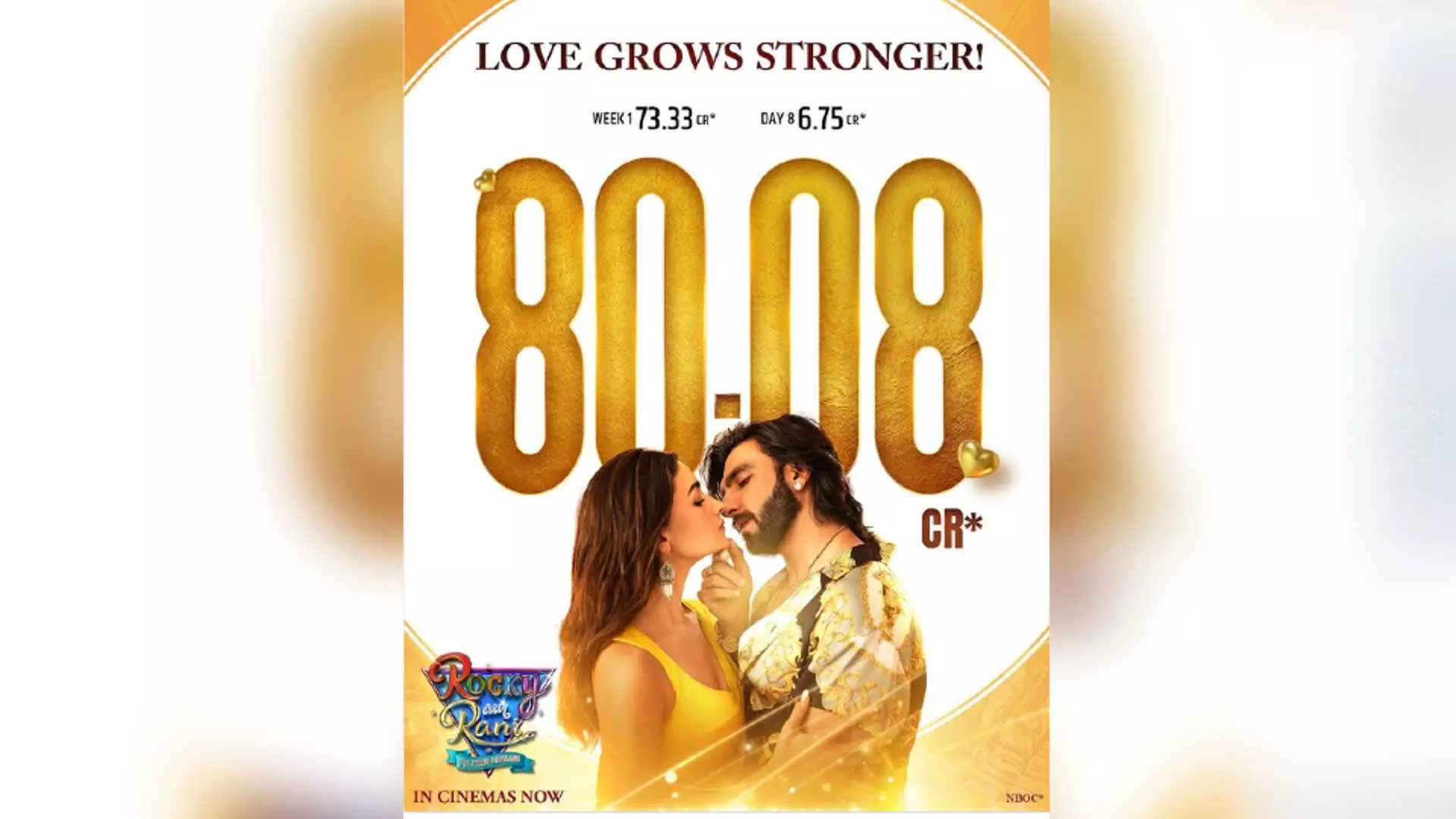 According to the banner, ''Rocky Aur Rani...'' raised Rs 6.75 crore on the eighth day of its release taking the first week total to Rs 80.08 crore. The movie also features cinema veterans Dharmendra, Jaya Bachchan and Shabana Azmi.