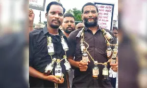 CHENGALPATTU: More than 500 AIADMK workers staged a unique protest wearing garlands made of liquor bottles around their neck demanding the dismissal of DMK Minister Senthilbalaji, here on Wednesday.
