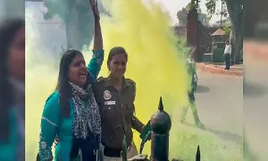 There was a huge security breach during Zero Hour in Parliament on Wednesday afternoon after two men, both carrying canisters that emitted yellow smoke, jumped from the visitors' gallery into the Lok Sabha chamber before they were overpowered by the MPs. Similarly, in another incident, two protestors -- Neelam (42) and Amol (25) -- protested outside the Parliament with similar gas canisters. However, all four were detained later.
