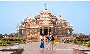 The Vance family visited the Akshardham temple where they posed for camera crews outside the shrine's imposing facade.