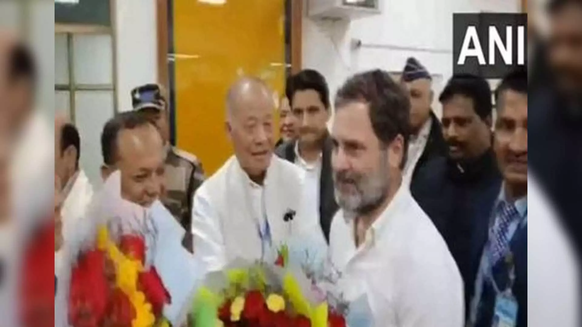 Rahul Gandhi received warm welcome from party leaders at Imphal (Photo/ANI)