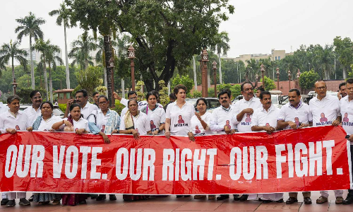 Congress MP Priyanka Gandhi Vadra and other INDIA bloc members seen wearing T-shirts featuring the name Minta Devi, a voter allegedly listed as 124 years old in the Election Commission's voter list, during their protest over the issues of 'poll fraud' and Special Intensive Revision of electoral rolls, at the Monsoon session of Parliament, in New Delhi, Tuesday, Aug. 12, 2025 (PTI)