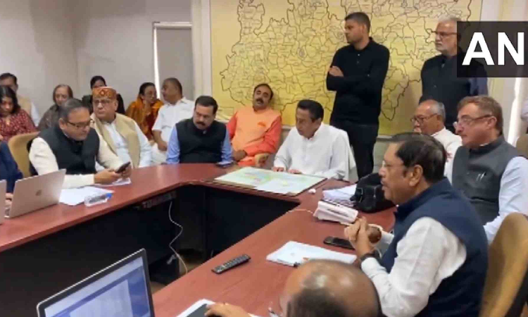 Madhya Pradesh Congress president Kamal Nath and other leaders of the party gather at the state party office in Bhopal.