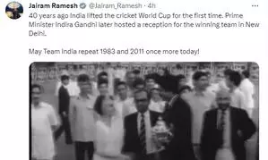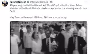 Ramesh, who is the Congress General secretary (Communication) shared an almost two minute long video of Indira Gandhi giving a reception to the 1983 World Cup team and said, "Forty (40) years ago India lifted the cricket World Cup for the first time. Prime Minister Indira Gandhi later hosted a reception for the winning team in New Delhi. May Team India repeat 1983 and 2011 once more today!"