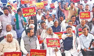 Karnataka CM Siddaramaiah leads a protest against distribution of federal funds by Union government, in New Delhi on Wednesday