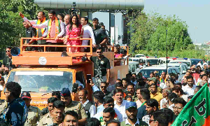 Fadnavis, accompanied by his wife Amruta Fadnavis, state BJP chief Chandrashekhar Bawankule and others boarded a decorated open-top vehicle at Nagpur airport. The route of the rally was dotted with banners welcoming the son-of-the-soil.