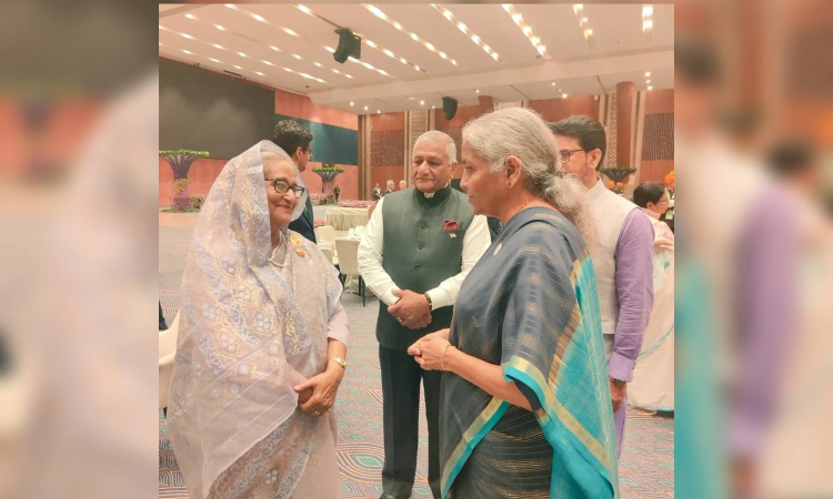 G-20 in India: Union Finance Minister Nirmala Sitharaman interacts with Prime Minister of Bangladesh Sheikh Hasina at the G-20 Dinner hosted by President Droupadi Murmu at Bharat Mandapam in New Delhi.