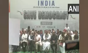 NEW DELHI: Leaders of the INDIA bloc on Friday staged a protest at the Jantar Mantar here against the suspension of 146 opposition MPs during the Parliament's Winter Session and demanded a detailed statement by Union Home Minister Amit Shah on December 13 Parliament security breach.