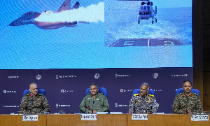 Director General of Military Operations (DGMO) Lt General Rajiv Ghai with Air Marshal AK Bharti, Vice Admiral AN Pramod and Major General SS Sharda during a press conference on 'Operation Sindoor', in New Delhi (PTI)