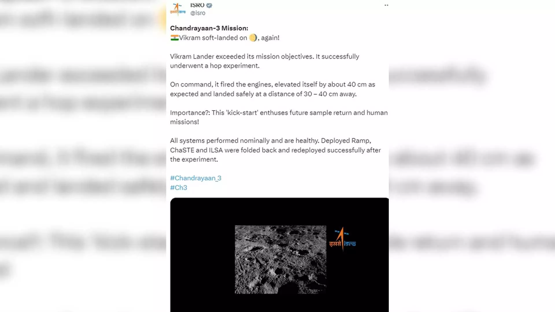 In a post on X, ISRO said: “Vikram Lander exceeded its mission objectives. It successfully underwent a hop experiment.” “On command, it fired the engines, elevated itself by about 40 cm as expected and landed safely at a distance of 30 – 40 cm away.”