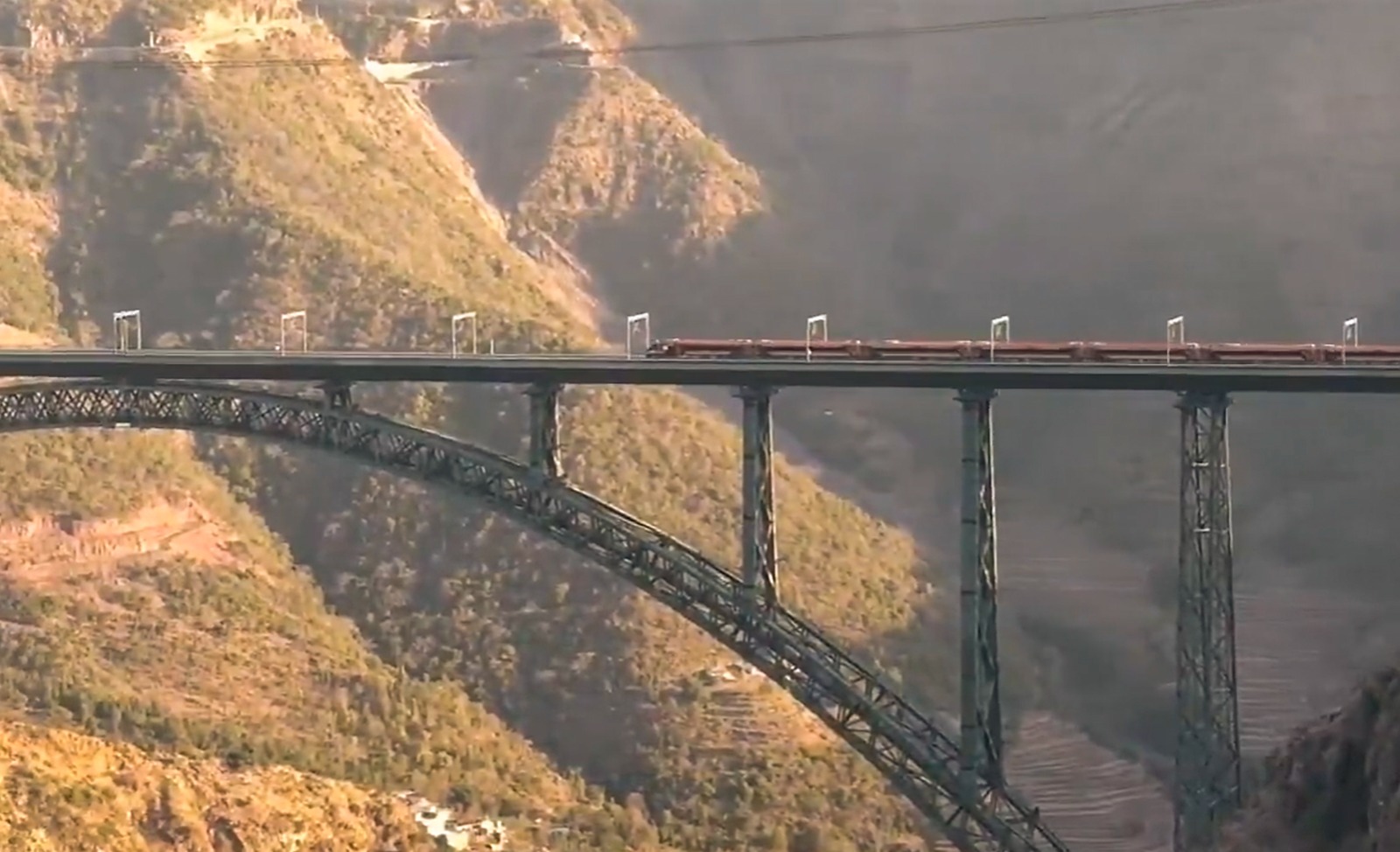 A Vande Bharat Express train on the Chenab Rail Bridge, in Jammu & Kashmir (PTI)