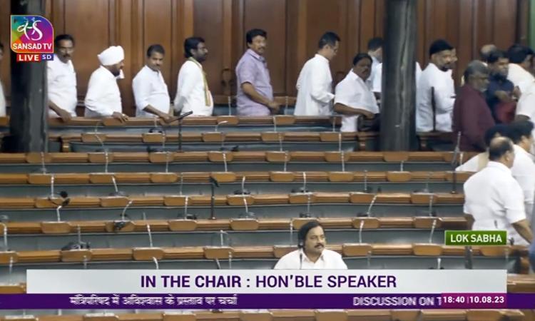 Opposition MPs walk out of the Lok Sabha as Prime Minister Narendra Modi speaks on No Confidence Motion