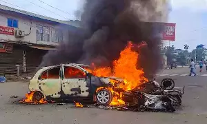 Vehicles in flames after violence broke out during the 'Tribal Solidarity March' called by All Tribal Student Union Manipur (ATSUM), in Imphal. (PTI)