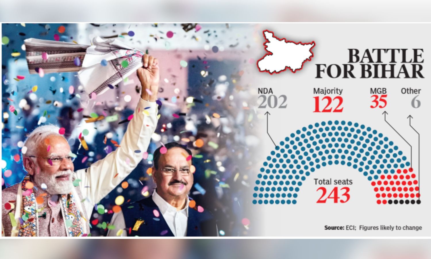 NEW DELHI: The ruling NDA decimated the Mahagathbandhan in Bihar on Friday to retain power, reaffirming Prime Minister Narendra Modi’s popularity and Chief Minister Nitish Kumar’s enduring appeal and dealing a body blow to the Congress and ally RJD.