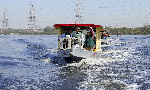 Delhi Minister Parvesh Sahib Singh Verma takes a boat ride during inspection of the cleanliness efforts at Yamuna ghats, in New Delhi, Wednesday, March 5, 2025 (PTI)