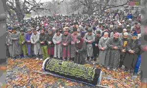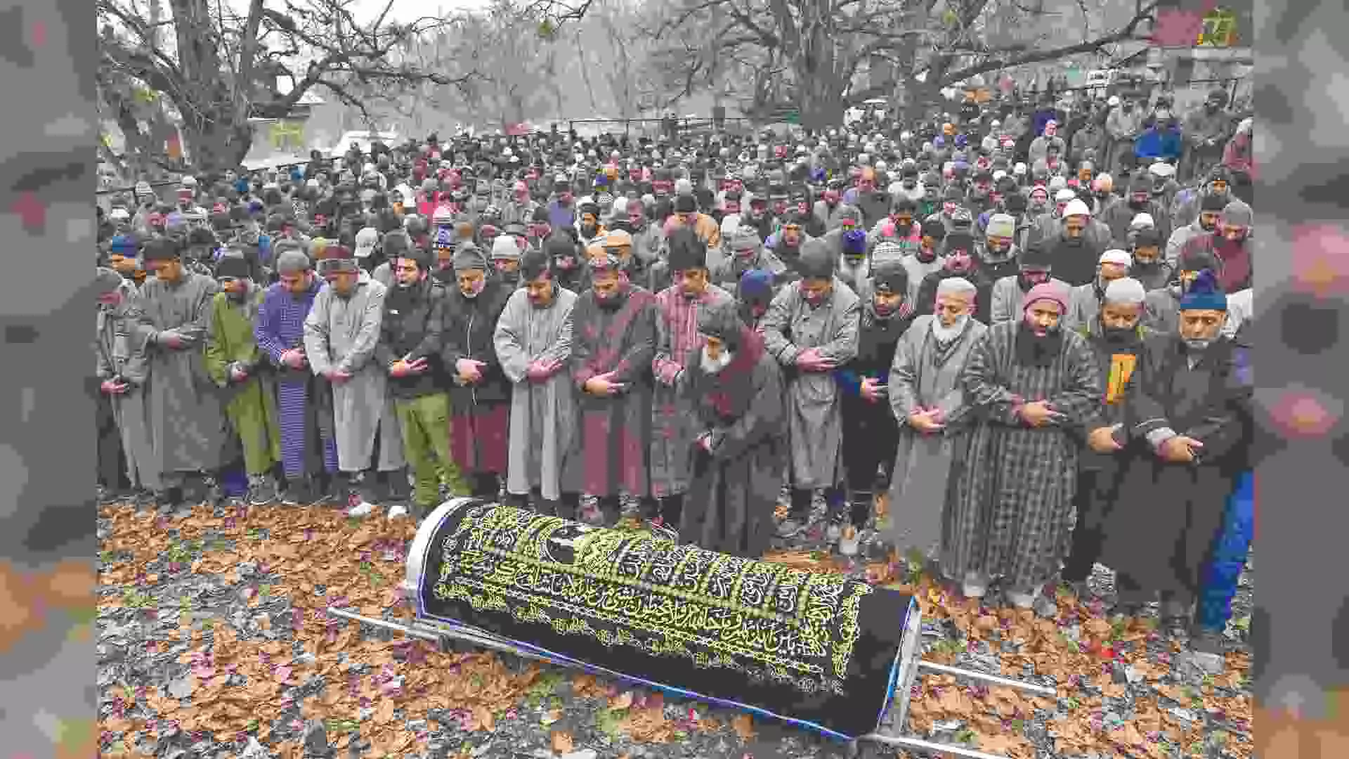 People offer funeral prayers to retired police officer killed by unknown militants in north Kashmir on Sunday