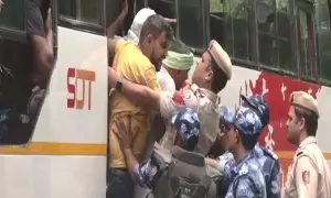 Security personnel detains protesting wrestlers as they move towards new Parl