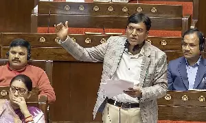 Union Minister Mansukh Mandaviya speaks in the Rajya Sabha during the Budget session of Parliament in New Delhi on Tuesday. (PTI)