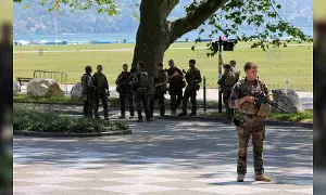 French soldiers secure the area after several children and an adult have been injured in a knife attack in Annecy, in the French Alps, France, June 8, 2023. (REUTERS)