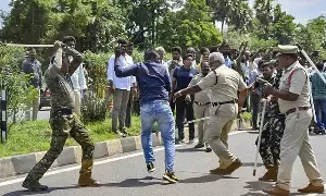 Police personnel lathi-charge TDP supporters protesting against the arrest of TDP chief Chandrababu Naidu.(PTI)