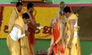 PM Modi was seen taking part in the puja rituals part of the foundation stone laying ceremony.