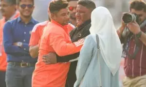 Sporting a ‘cricket is everyone’s game’ written on the back of the jacket, a visibly teary-eyed and proud Naushad hugged him with joy and kissed the Indian badge on the Test cap, even as Sarfaraz was wiping off the tears from his wife’s eyes