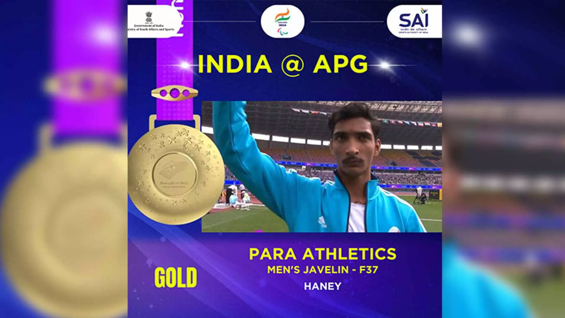 HANGZHOU: Haney secured India's 11th gold medal in the ongoing 4th Asian Para Games by setting a record in the games in the men's Javelin Throw Throw-F37/38 final here on Wednesday. Haney set the Asian Para Games record with a throw of 55.97m to bag another gold. Iran's Hormoz Seidikazpounji with his season-best throw of 48.47m clinched a silver medal. While China's Dongquan An settled for the bronze medal.