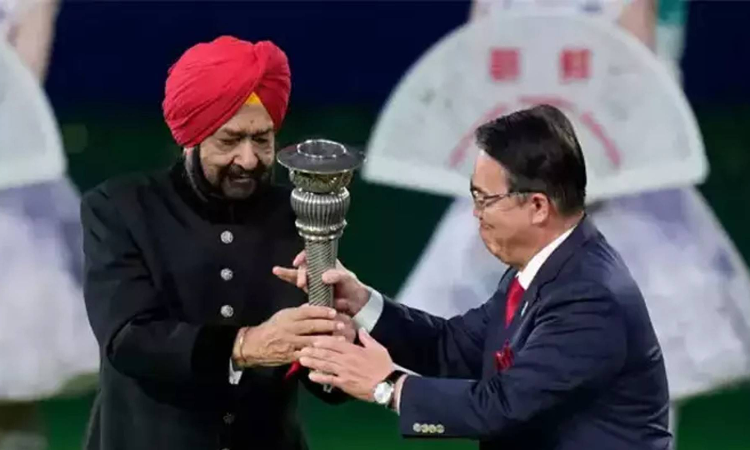 Acting President of OCA Raja Randhir Singh hands over the torch to Governor of Aichi Prefecture Hideaki Omura during the handover ceremony.