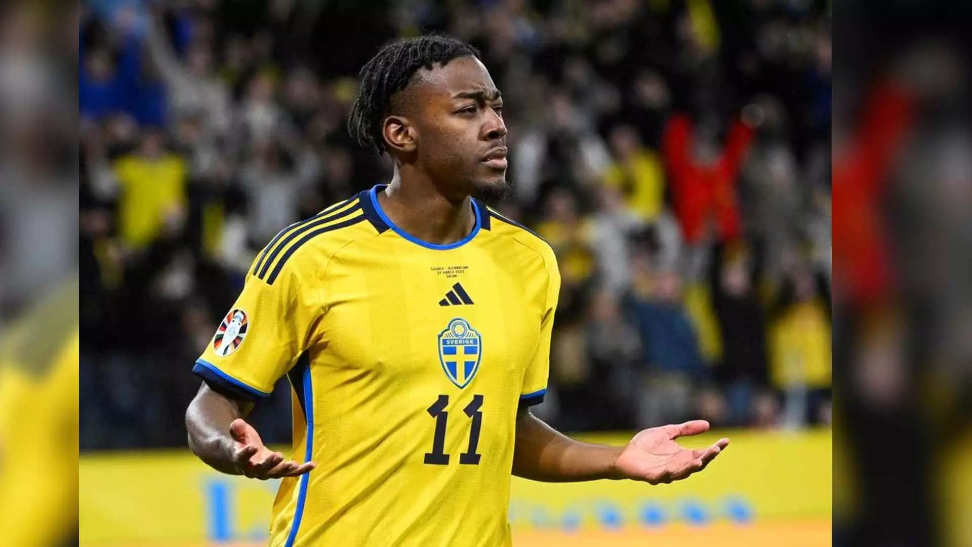 Sweden's Anthony Elanga celebrates scoring their fifth goal Fredrik Sandberg (Photo: Reuters)