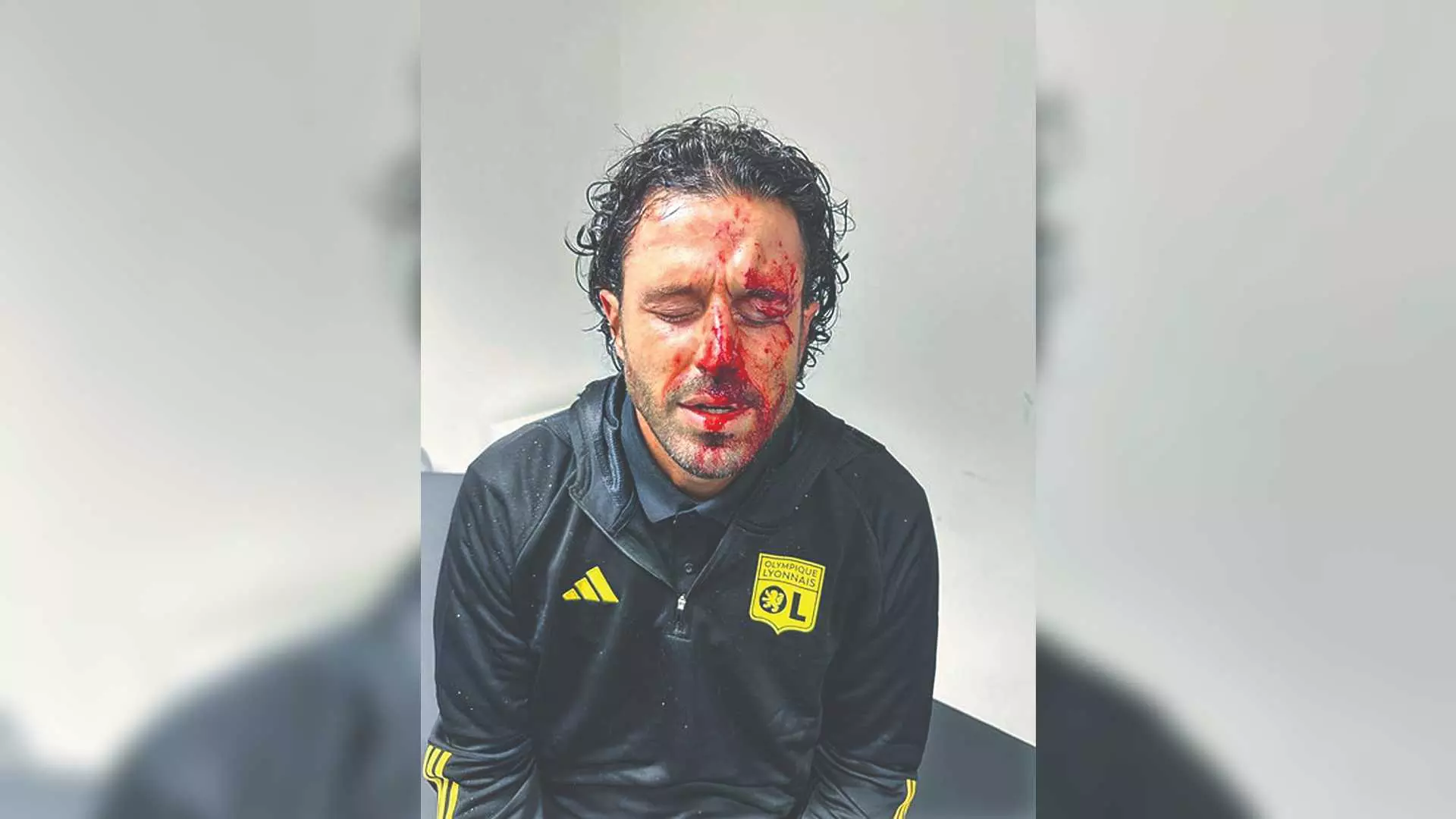 Blood stricken face of Lyon’s coach Fabio Grosso